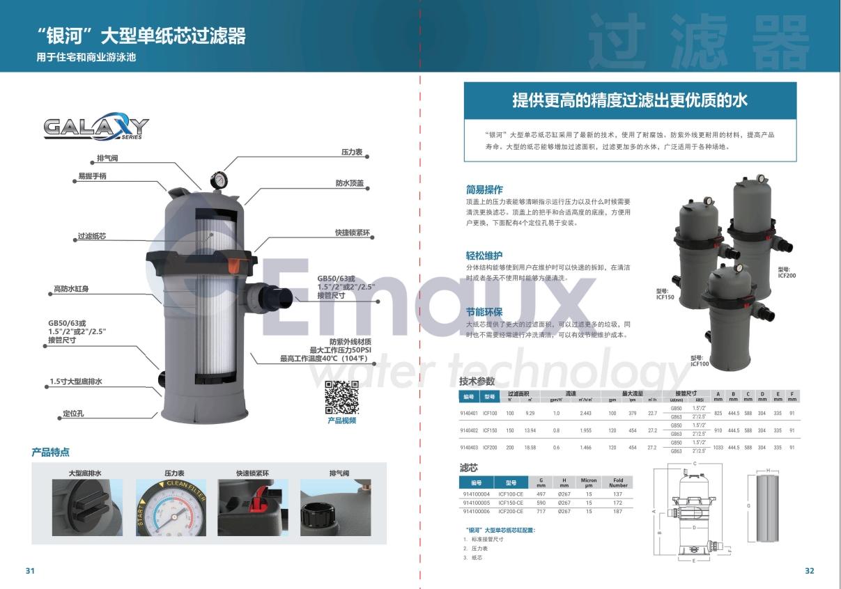 “銀河”大型單芯紙芯缸采用了最新的技術(shù),使用了耐腐蝕、防紫外線更耐用的材料,提高產(chǎn)品壽命。大型的紙芯能夠增加過(guò)濾面積,過(guò)濾更加多的水體,廣泛適用于各種場(chǎng)地。