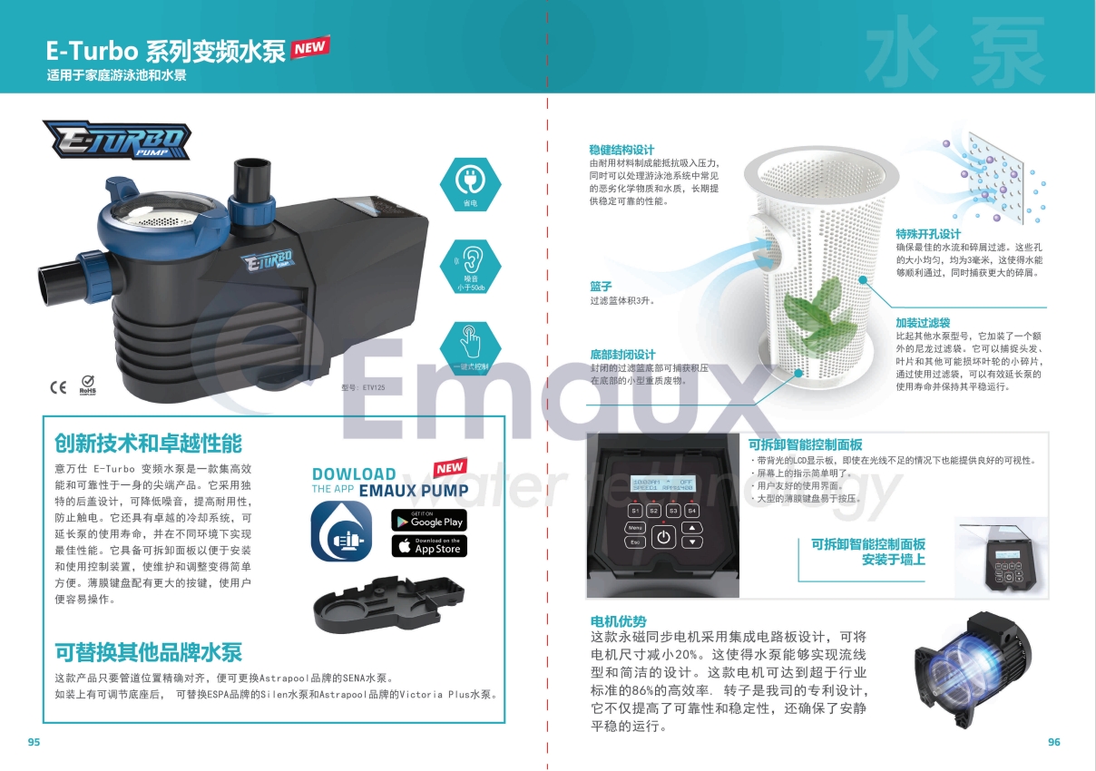 意萬仕 E-Turbo 變頻水泵是一款集高效能和可靠性于一身的尖端產(chǎn)品。它采用獨特的后蓋設(shè)計,可降低噪音,提高耐用性,防止觸電。它還具有卓越的冷卻系統(tǒng),可延長泵的使用壽命,并在不同環(huán)境下實現(xiàn)最佳性能。它具備可拆卸面板以便于安裝和使用控制裝置,使維護(hù)和調(diào)整變得簡單方便。薄膜鍵盤配有更大的按鍵,使用戶便容易操作。