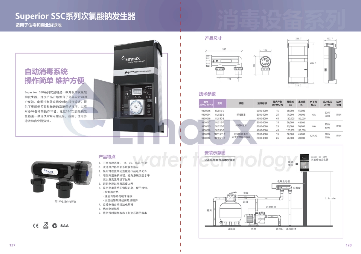 競(jìng)技池Superior SSC系列次鹽機(jī)是一款升級(jí)的次氯酸鈉發(fā)生器這次產(chǎn)品升級(jí)整合了多年設(shè)計(jì)和用戶反饋。電源控制器采用全新的現(xiàn)代設(shè)計(jì),提供了更簡(jiǎn)便界面和先進(jìn)的系統(tǒng)保護(hù)程序,以應(yīng)對(duì)各種各樣的操作環(huán)境。這款SSC次氯酸鈉發(fā)生器是一款經(jīng)久耐用可靠設(shè)備,適用于住宅游泳池和商業(yè)游泳池。