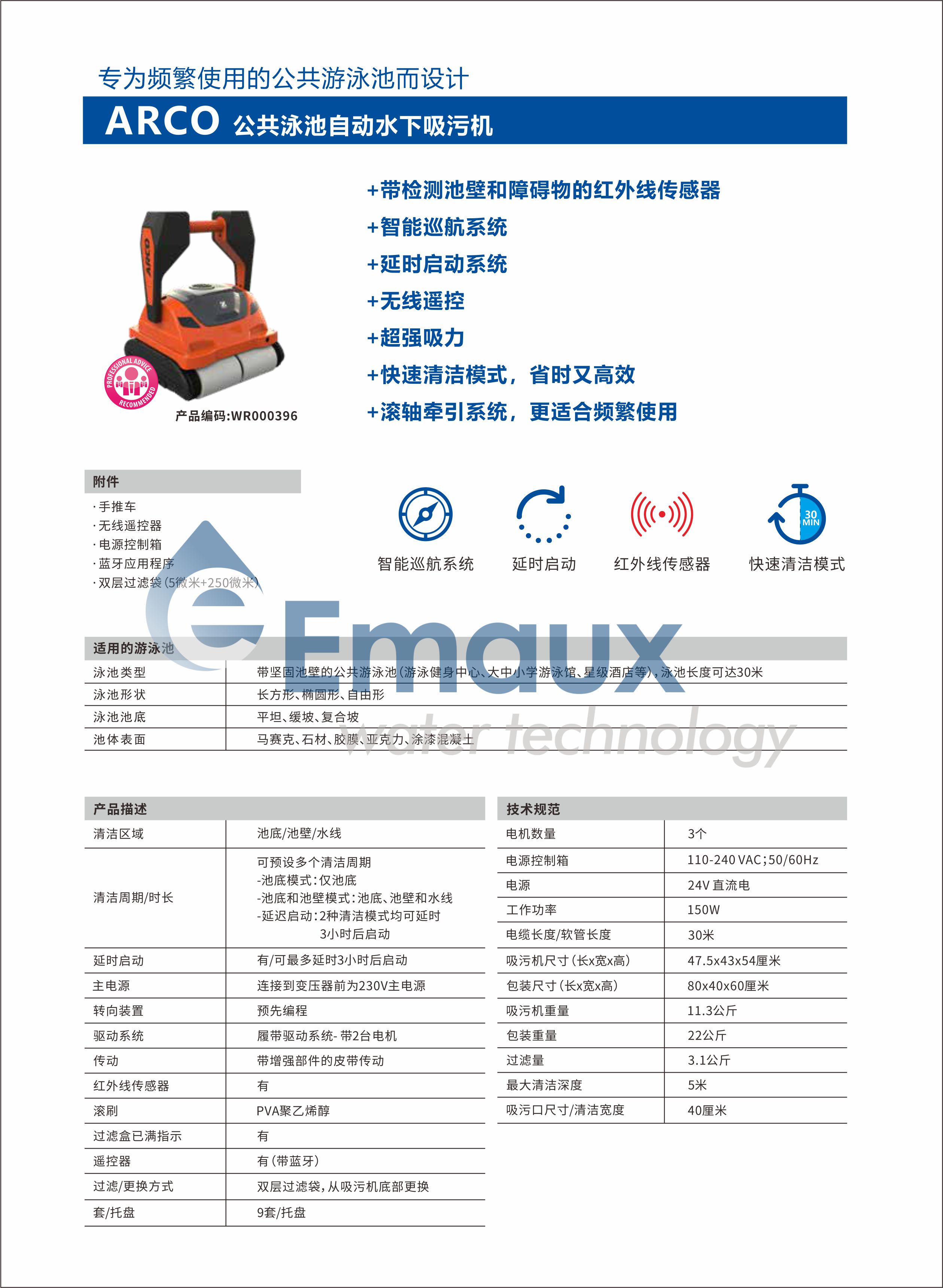 ★氣旋抽吸技術(shù)+超強吸污能力 ★雙層過濾袋 ★滾軸牽引系統(tǒng),更適合頻繁使用 ★帶檢測池壁和障礙物的紅外線傳感器 ★無線遙控,能手動能定點操作清潔 ★智能巡航系統(tǒng) ★配有手推車,使用更方便 ★專為頻繁使用的公共游泳池而設計