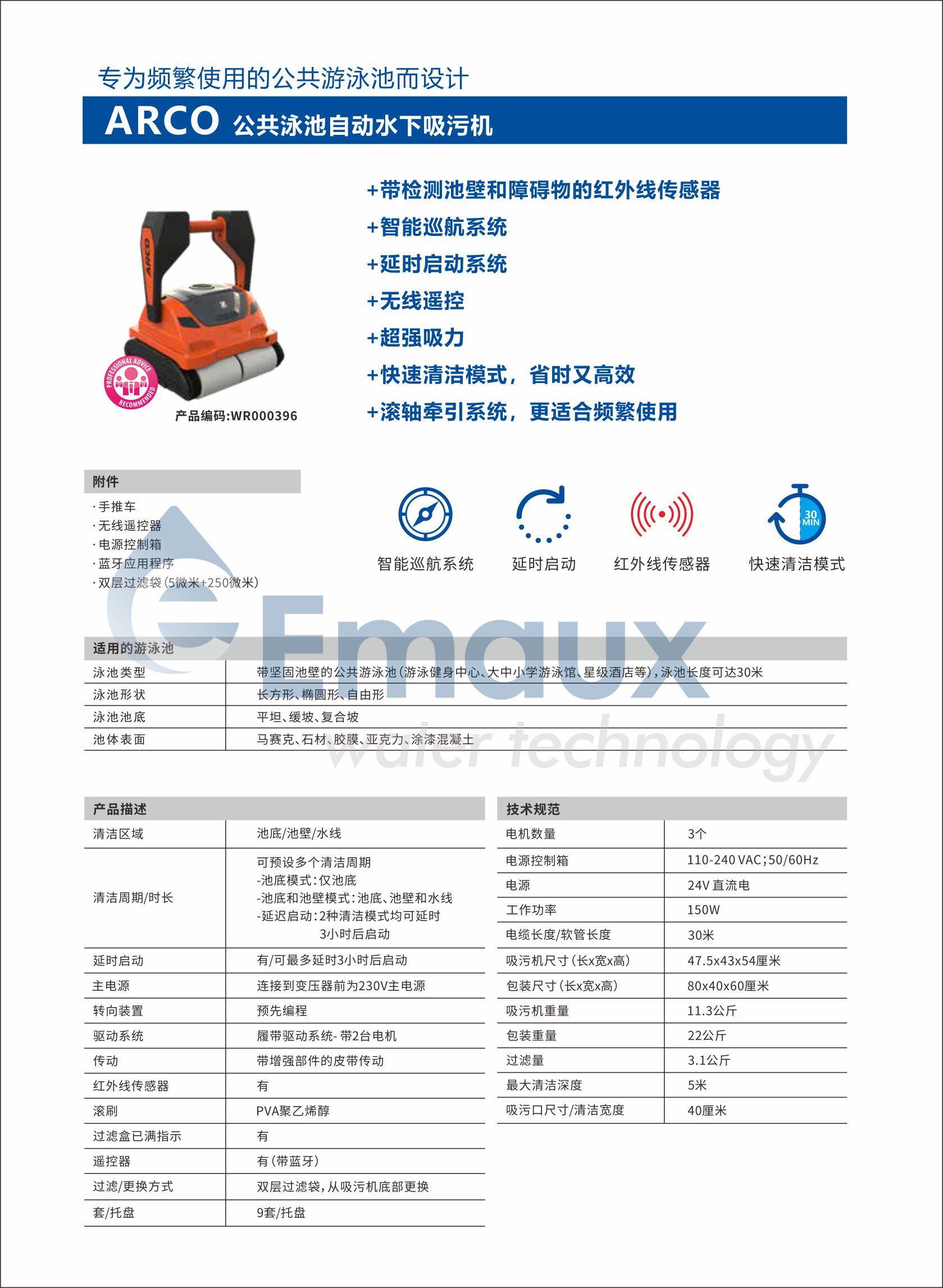 ★氣旋抽吸技術+超強吸污能力 ★雙層過濾袋 ★滾軸牽引系統,更適合頻繁使用 ★帶檢測池壁和障礙物的紅外線傳感器 ★無線遙控,能手動能定點操作清潔 ★智能巡航系統 ★配有手推車,使用更方便 ★專為頻繁使用的公共游泳池而設計