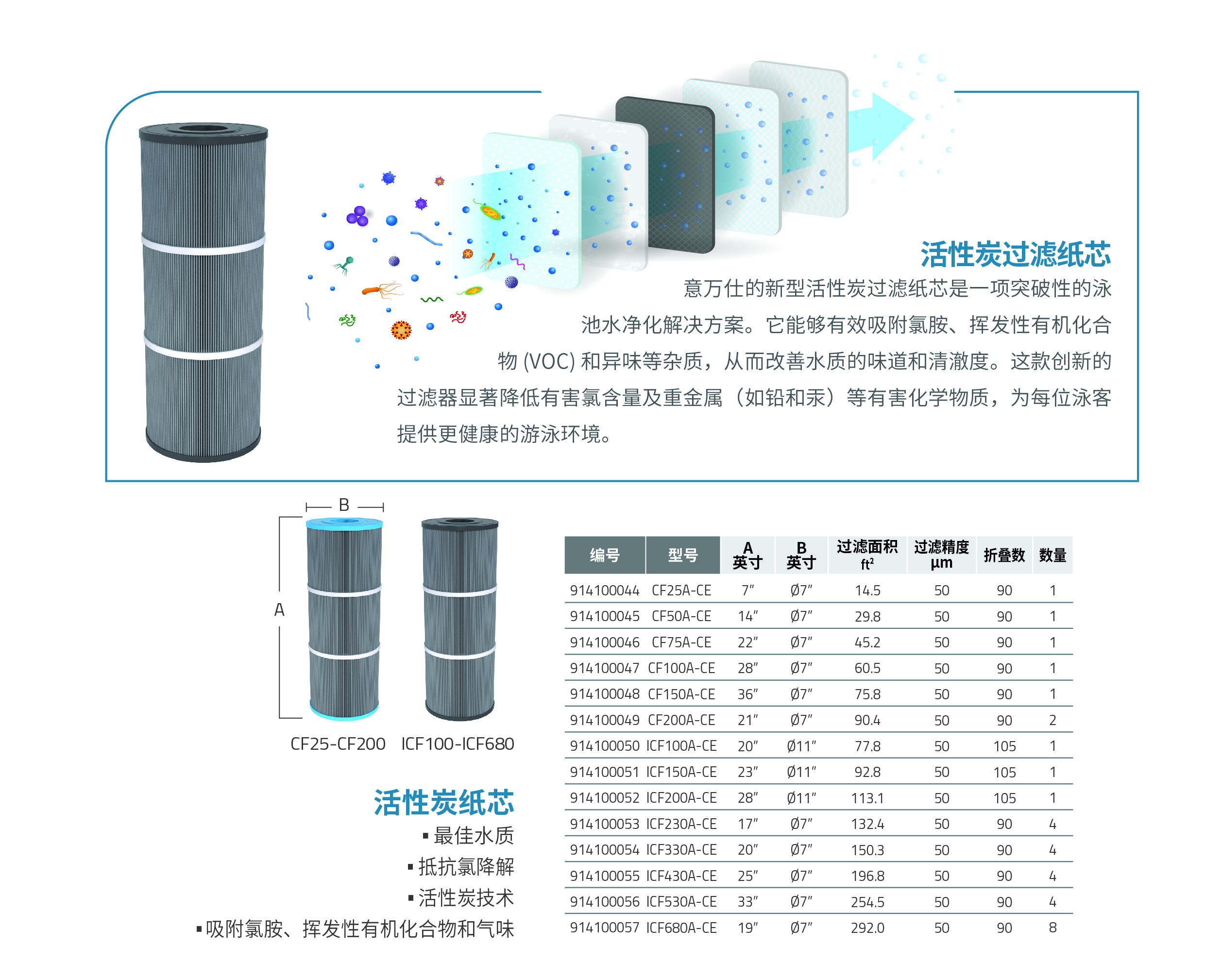 意萬仕的新型活性炭過濾紙芯是一項突破性的泳 池水凈化解決方案。它能夠有效吸附氯胺、揮發性有機化合 物 (VOC) 和異味等雜質,從而改善水質的味道和清澈度。這款創新的 過濾器顯著降低有害氯含量及重金屬(如鉛和汞)等有害化學物質,為每位泳客提供更健康的游泳環境。