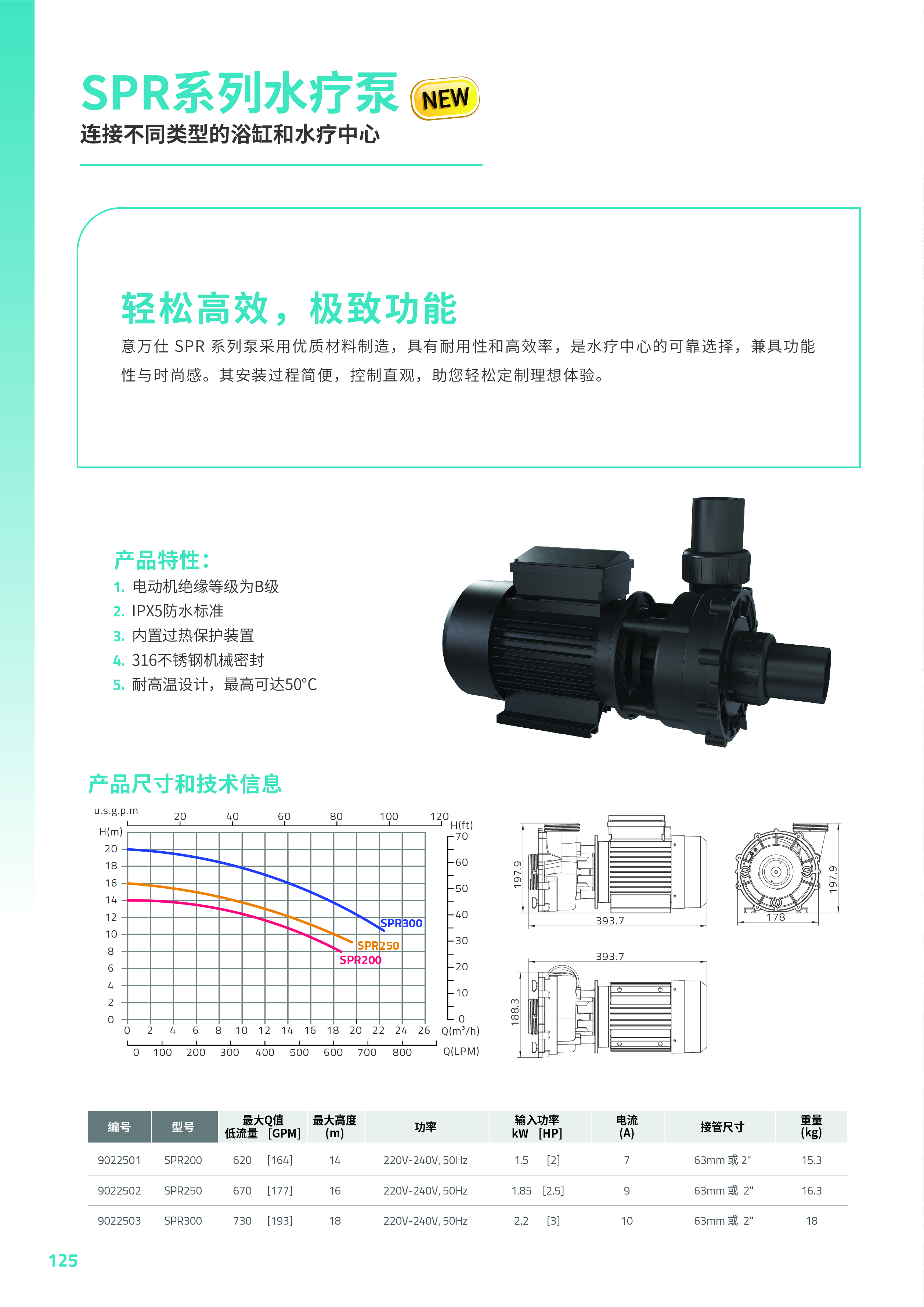 意萬仕 SPR 系列泵采用優(yōu)質(zhì)材料制造,具有耐用性和高效率,是水療中心的可靠選擇,兼具功能 性與時尚感。其安裝過程簡便,控制直觀,助您輕松定制理想體驗(yàn)。