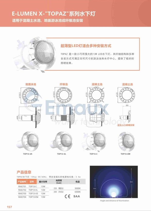 TOPAZ 是一款小巧而強大的13W LED水下燈。其纖細結構和多種安裝方式可滿足任何尺寸的游泳池和水療中心,提供了極好的照明效果。