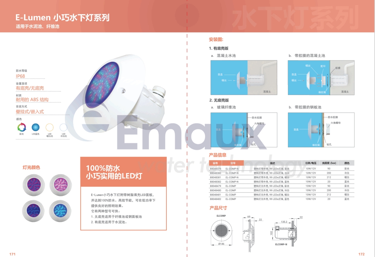 E-Lumen小巧水下燈附帶樹脂填充LED面板,并達到100%防水。高效節能,可在低功率下提供良好的照明效果。 E-Lumen它有兩種型號可供: 無底殼適用于纖維池或鋼面板池;有底殼適用于水泥池。