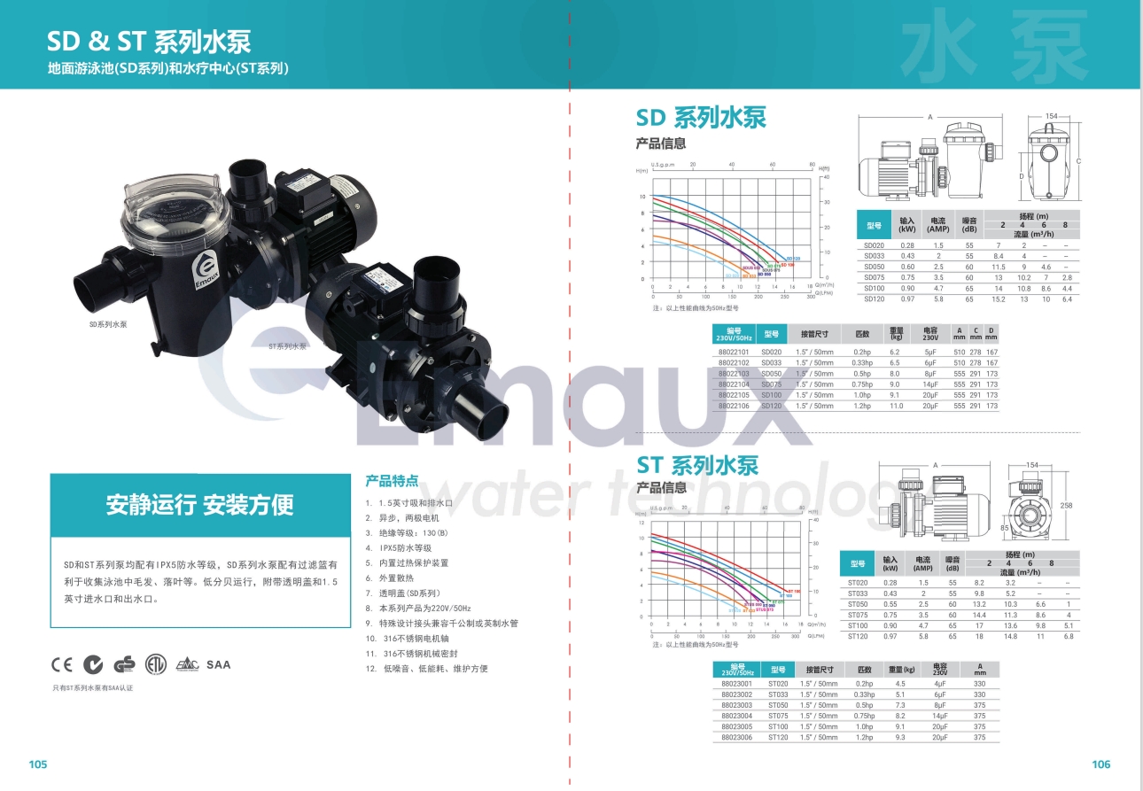 競技池SD和ST系列泵均配有IPX5防水標(biāo)準(zhǔn),SD系列水泵配有過濾籃有利于收集泳池中毛發(fā)、落葉等。低分貝運(yùn)行,附帶透明蓋和1.5英寸進(jìn)水口和出水口。