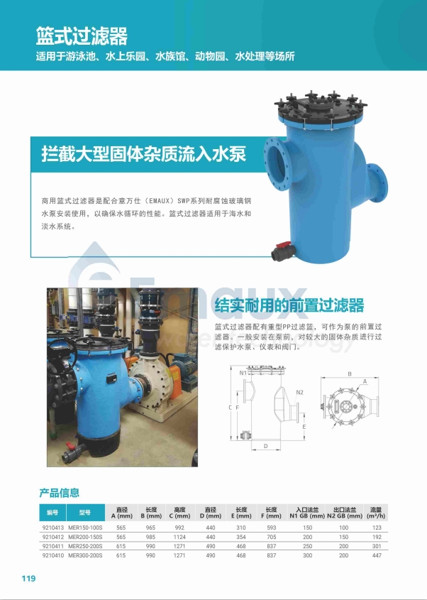 商用籃式過濾器是配合意萬仕(EMAUX)SWP系列耐腐蝕玻璃鋼水泵安裝使用,以確保水循環的性能。籃式過濾器適用于海水和淡水系統。
