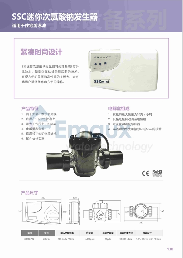 SSC迷你次氯酸鈉發(fā)生器可處理最高9萬(wàn)升泳池水,新型迷你鹽機(jī)采用嶄新的技術(shù),直觀方便的界面和高性能的主板為廣大市場(chǎng)用戶(hù)提供優(yōu)惠和方便的操作。