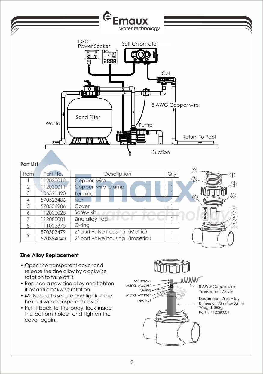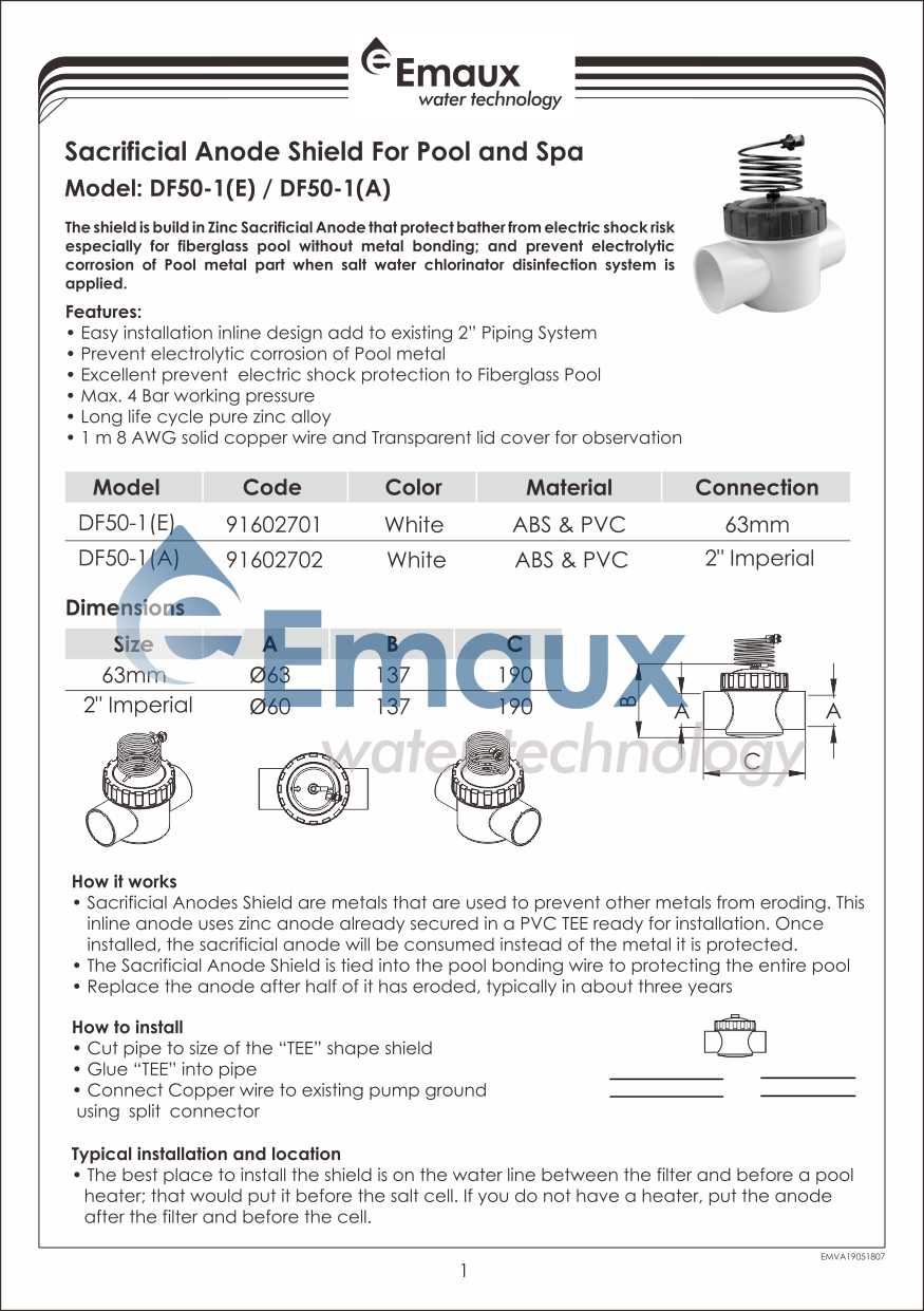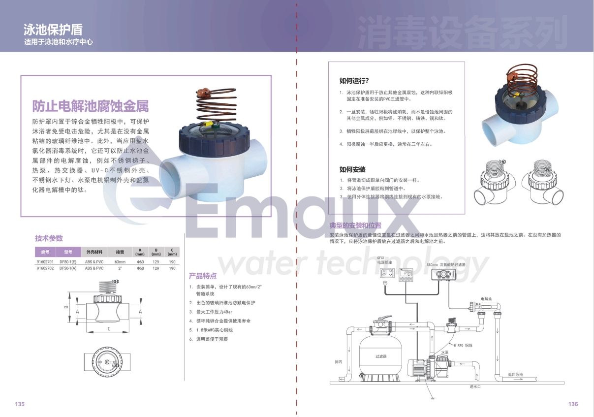 防護罩內置于鋅犧牲陽極中,可保護沐浴者免受電擊危險,尤其是在沒有金屬粘結的玻璃纖維池中。此外,當應用鹽水氯化器消毒系統時,它還可以防止水池金屬部件的電解腐蝕,例如不銹鋼梯子,熱泵熱交換器, UV-C不銹鋼外殼,不銹鋼水下燈,水泵電機鋁制外殼和鹽氯化器電解槽中的鈦。